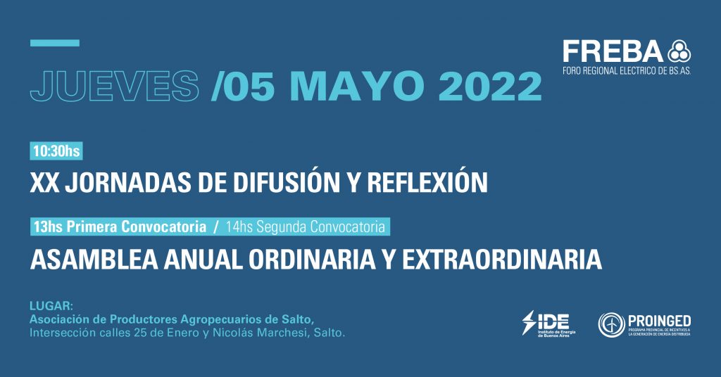 Nos dirigimos a ustedes en representación de la Comisión Directiva del Foro Regional Eléctrico de la Provincia de Buenos Aires -FREBA-, a fin de convocarlos a la Asamblea Anual Ordinaria y Extraordinaria del FREBA, a realizarse el día jueves 5 de mayo de 2022 a las 13:00 hs -Primera Convocatoria- y 14:00 hs. -Segunda Convocatoria- , se realiza de conformidad a lo resuelto por Acta de Comisión Directiva N.º 168 de fecha 15 de marzo de 2022., la cual se llevará a cabo en el predio de la Asociación de Productores Agropecuarios de Salto, sita en las intersecciones de las calles 25 de enero y Nicolás Marchessi de la Ciudad de Salto, Provincia de Buenos Aires.