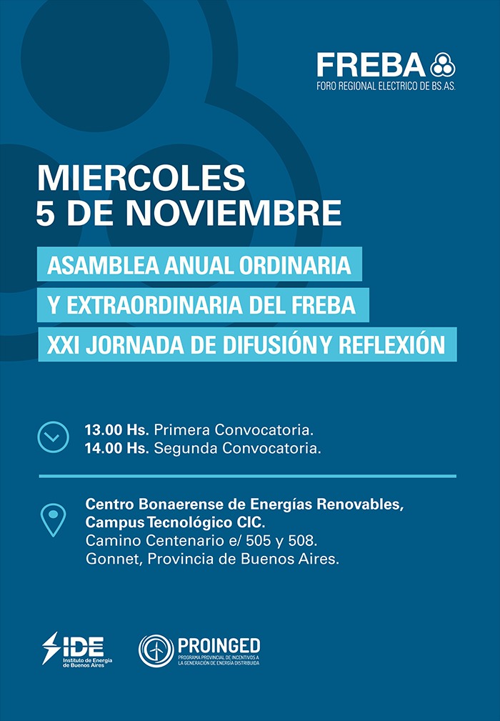 El Foro Regional Eléctrico de la Provincia de Buenos Aires (FREBA) tiene el agrado de anunciar la realización de su Asamblea Anual Ordinaria y Extraordinaria, junto con las XXI Jornadas de Difusión y Reflexión, que se llevarán a cabo el próximo miércoles 5 de noviembre en la ciudad de La Plata.