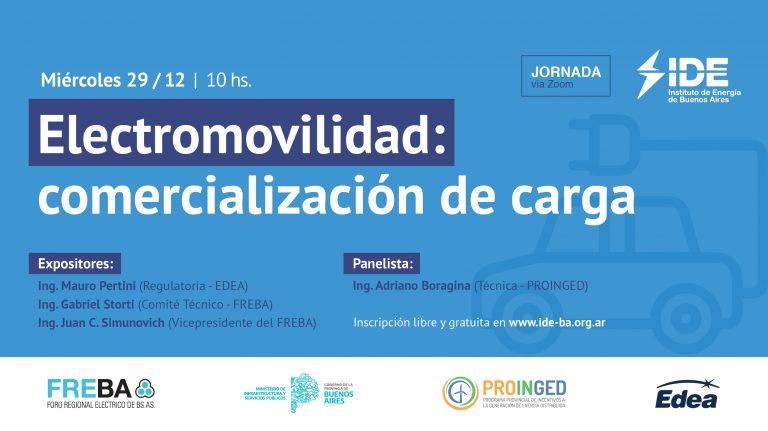 El próximo miércoles 29 de diciembre a las 10 Hs., se llevará a cabo la Jornada del IDE sobre Electromovilidad: Comercialización de carga, donde el Vicepresidente del FREBA Ing. Juan Carlos Simunovich junto al Ing. Gabriel Storti del Comité Técnico del FREBA; Mauro Pertini Ing. de EDEA y el Ing. Adriano Boragina del PROINGED, realizaran la presentación.