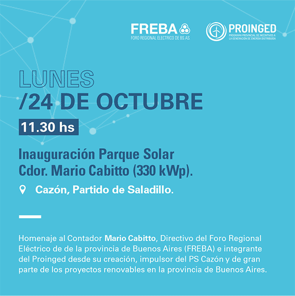 El consejo de Administración de la Cooperativa Eléctrica de Saladillo -CES-, con participación de los miembros de la Comisión Directiva del FREBA, realizarán un homenaje al Cdor. Mario Cabitto, quien se desempeñó como Directivo del Foro Regional Eléctrico de la provincia de Buenos Aires -FREBA- e integrante del Programa de Incentivos a la Generación Distribuida -PROINGED- desde su creación, impulsor del Parque Solar Cazón y de gran parte de los proyectos renovables en la provincia de Buenos Aires.
